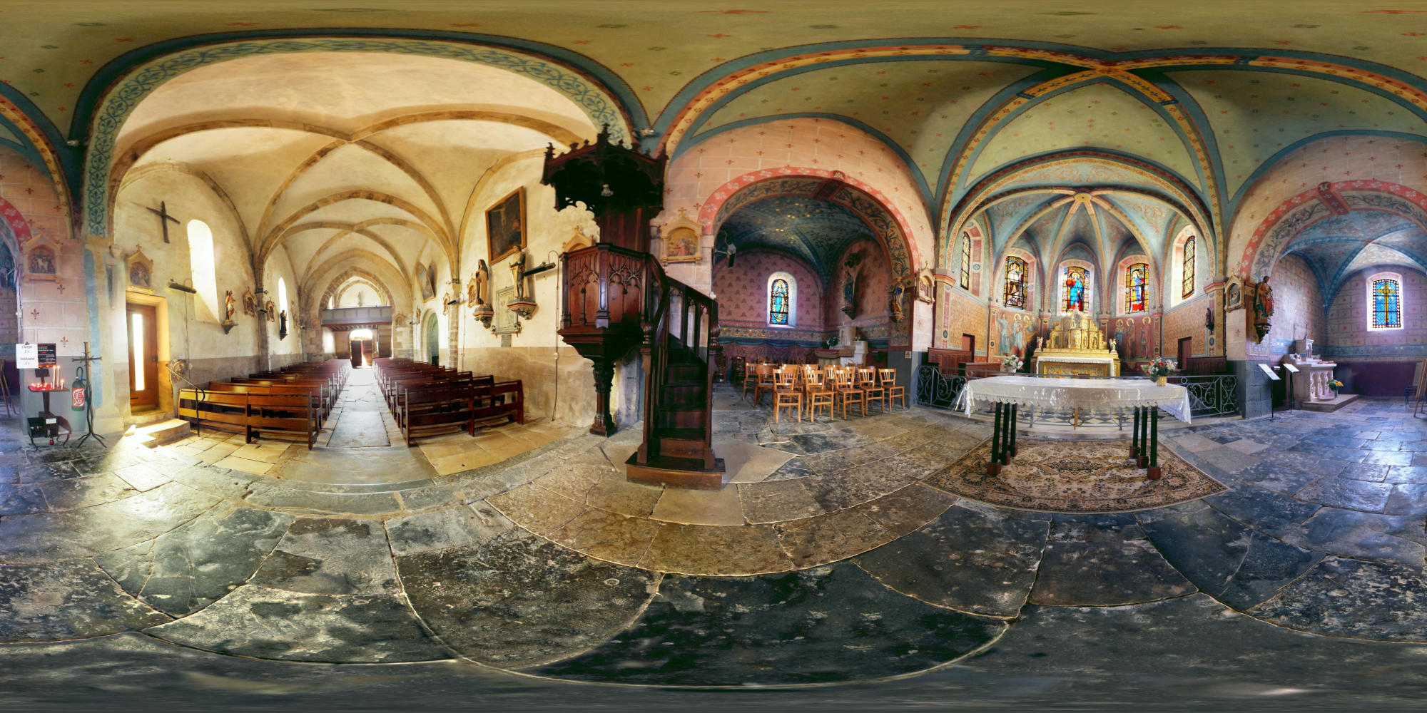 au chevet; le porche, sous le clocher, les deux travées de la nef et la chapelle sont voûtés avec membrures