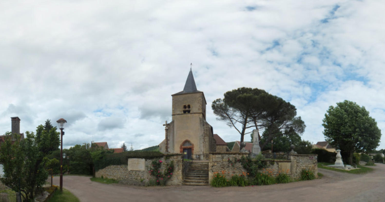 gothique. Clocher-porche carré roman, percé sur chaque face de deux baies cintrées à colonnettes,